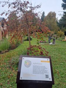 Im Anschluss besuchten wir den Trauerpfad auf dem Friedhof Cotta. Bei herbstlichem Wetter und Wind entstand eine fast mystische Stimmung. An zwölf Stationen konnte die Klasse Phasen der Trauer anhand von Symbolen, Gegenständen und Kunstwerken erleben, von der Erschütterung über den Verlust bis zur Annahme und dem Weitergehen. Die Trauer ist allerdings sehr individuell und jeder durchlebt die Phasen ganz unterschiedlich, verweilt kürzer oder länger in einer Phase und durchlebt vielleicht auch nicht alle davon und nicht unbedingt der Reihe nach. Trauer ist so individuell wie wir Menschen es sind und jeder darf so trauern, wie es für ihn nötig ist. Über Brücken, Klangspiele und andere Sinnbilder führte uns der Weg zu Gesprächen über eigene Erfahrungen mit Trauer, um Menschen, um Tiere und Abschiede jeder Art.