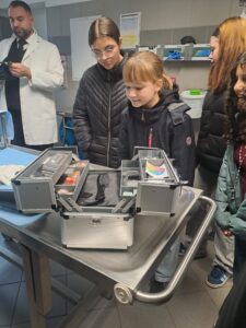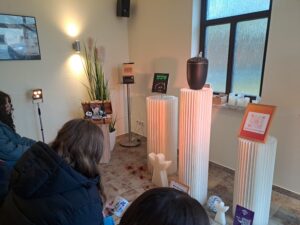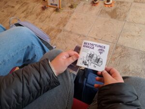 Frau Steglich, hatte diesen Tag mit viel Herz und Sorgfalt vorbereitet. In der kleinen Trauerhalle wurden wir mit Musik und in der Atmosphäre einer echten Trauerfeier empfangen. Das war für viele zunächst ein ungewohntes und bewegendes Gefühl. Herr Gloss und Herr Schulz brachen mit Humor und Offenheit dann wieder etwas Leichtigkeit in das Thema, was jeden Menschen einmal betreffen wird und beantworteten geduldig alle Fragen, wie zum Beispiel welchen Arten der Bestattung es alles gibt, welche Rituale und Entscheidungen Angehörige begleiten in der schwierigen Zeit der Trauer, wie tief Erdgräber sind, was mit einem Verstorbenen im Bestattungshaus passiert oder wie man Bestatter werden kann. Die Schüler zeigten großes Interesse durch interessiertes Nachfragen und lernten unter Anderem auch, wieviel Mitgefühl und Menschlichkeit zu diesem Beruf gehören, so dass Menschen ihren letzten Weg in Würde erfahren dürfen.